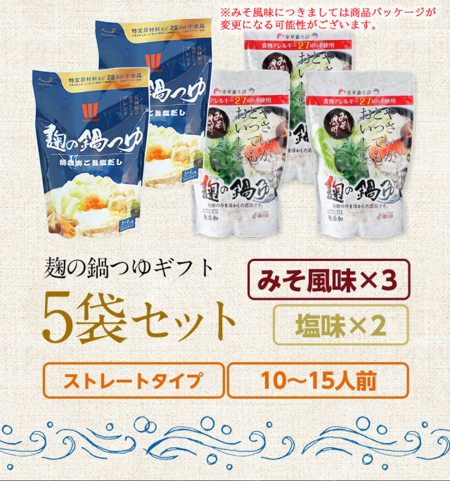 TOP無添加の調味料(醤油・ぽん酢・唐辛子等) 『麹の鍋つゆギフト5袋セット』【ギフト対応】 通常価格: ¥3,300(税込) 価格: ¥3,300 (税込) [ポイント還元 33ポイント〜] 販売期間: メーカー: 樽の味 のし紙: のし紙をご希望の方はご選択ください。 選択してください 無地のし 御中元のし 御歳暮のし 母の日のし 父の日のし 御年賀のし 内祝いのし 結婚祝いのし 結婚内祝いのし 誕生祝いのし 敬老の日のし その他のし(通信欄にご記入ください) のし名入れ: 贈り主様のお名前は配送業者伝票でご確認いただけますので、原則無記名とさせていただきます。 何卒ご了承くださいますようお願いいたします。 選択してください 無記名 メッセージカード: メッセージカードをご希望の方はご選択ください。 選択してください 御中元定型文 御歳暮定型文 御年賀定型文 御結婚祝い用定型文 結婚内祝い用定型文 お返し用定型文 お誕生日用定型文 数量: 個 在庫: ○在庫あり 在庫 ○在庫あり 返品についての詳細はこちら レビューはありません 【麹の鍋つゆギフト5袋セット】※お知らせ 1月下旬より「みそ風味」のパッケージが変更となりました 商品仕様 メーカー: 樽の味