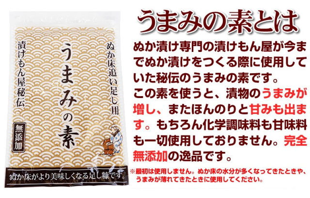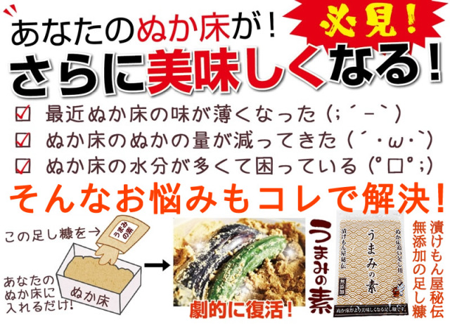御社の漬物セットを購入後、美味しい漬物生活をさせていただいています。特にこだわりはなく季節の野菜を漬けています。どうしてもヌカが減るので御社の「足しぬか うまみの素」を購入させていただいています。こんな足しぬかは他にはないですね、すごく味がいいし、何か漬物に深みまで感じます。