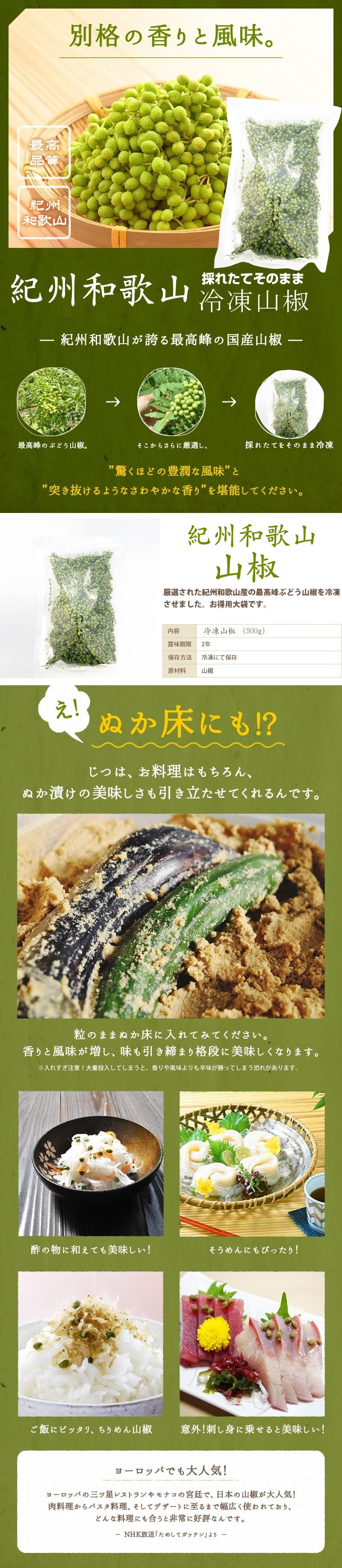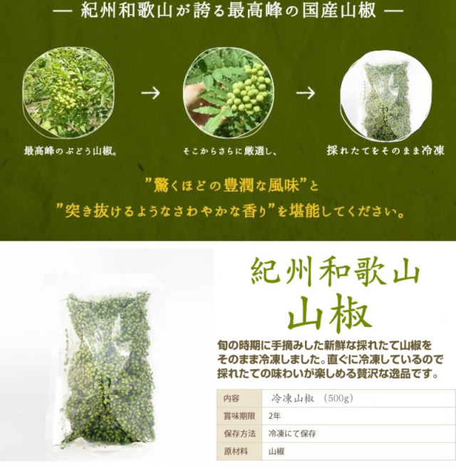 TOP紀州和歌山の山椒 『そのまま冷凍山椒500g』 通常価格: ¥8,000(税込) 価格: ¥8,000 (税込) [ポイント還元 80ポイント〜] 販売期間: 数量: 個 在庫: ○在庫あり 在庫 ○在庫あり 返品についての詳細はこちら レビューはありません