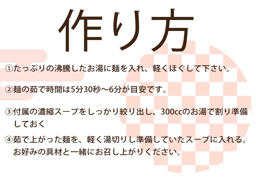 | 使用方法 | 麺を茹で、スープにお湯を注ぎ、茹でた麺をいれてお召し上がりください |
