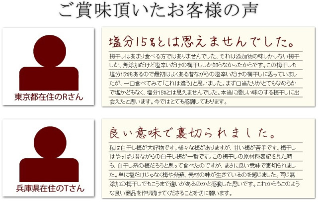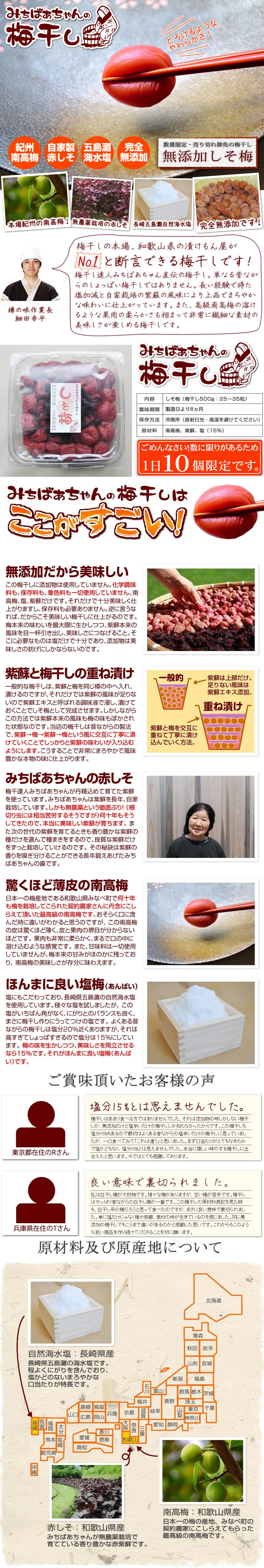 TOP無添加の梅干し 『みちばあちゃんの梅干し「しそ梅」500g』3個まで購入可能 通常価格: ¥3,480(税込) 価格: ¥3,480 (税込) [ポイント還元 34ポイント〜] 販売期間: 数量: 個 在庫: ○在庫あり 在庫 ○在庫あり 返品についての詳細はこちら 5.0 (1件) みちばあちゃんの梅干し「しそ梅」500g お客様の声 さかき様 投稿日:2022年10月24日 おすすめ度: やっぱりこの梅干しが一番。この梅干しを切らしてしまって、他の梅干しを購入すると皮が固くて、小ぶりでしょっぱくて後悔。この梅干しが一番食べやすくて美味しいです。